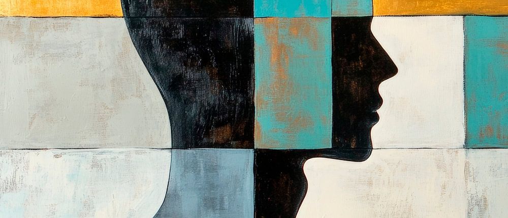 Un jeu fascinant de formes et de couleurs se déploie ici, avec un profil stylisé qui brille d'un noir intense sur une palette d'or, d'aigue-marine et de tons doux. Cette composition harmonieuse complète particulièrement bien un bureau créatif ou un salon moderne, où l'inspiration et l'esthétique vont de pair.