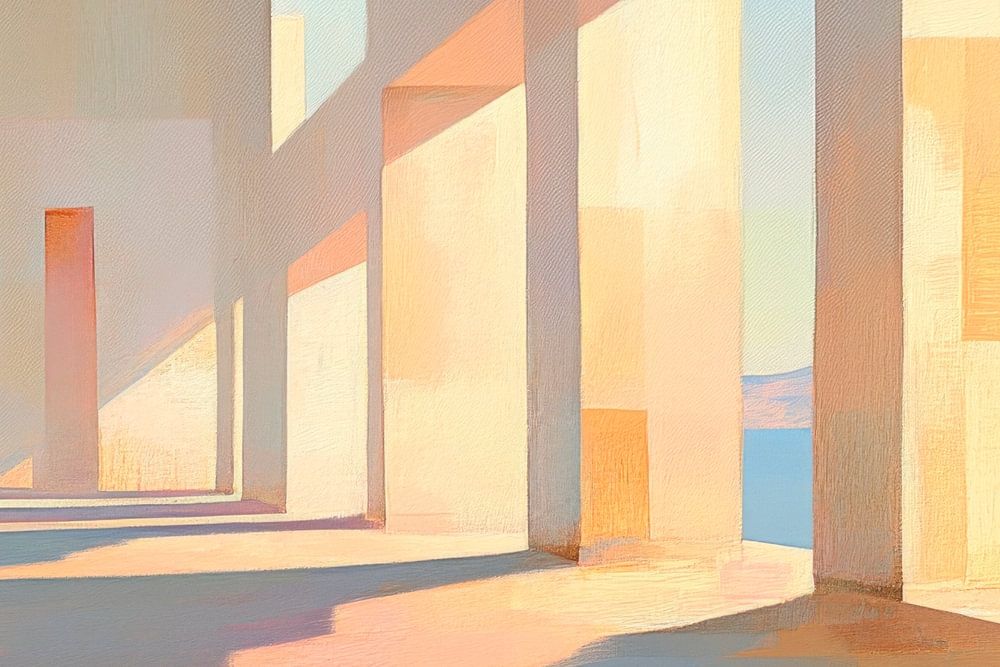 De doux tons pastel et des jeux de lumière harmonieux confèrent à cette œuvre une atmosphère de rêve. Les éléments architecturaux, qui semblent mener à l'infini, invitent à la rêverie. Idéale pour un salon, elle favorise la détente et inspire des conversations créatives - un accroche-regard qui stimule l'imagination.