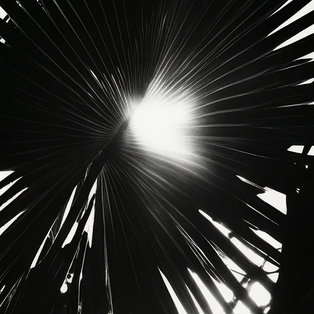 Des feuilles de palmier ombragées se déploient tandis qu'une douce lumière rayonne à travers leurs structures denses en forme d'éventail. Les forts contrastes entre l'obscurité et la clarté créent un jeu fascinant de formes et de profondeurs qui entraîne le spectateur dans un monde de rêve tropical où la nature et la lumière dansent harmonieusement ensemble.