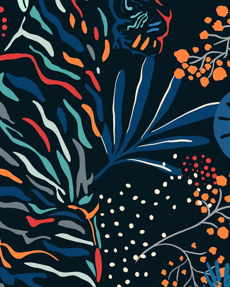 Une toile abstraite de couleur marine sert de toile de fond, avec la silhouette d'un tigre au centre de la scène, enveloppée d'une explosion de feuilles électriques et vibrantes. Un kaléidoscope de couleurs danse et joue, créant une fête visuelle pour les sens