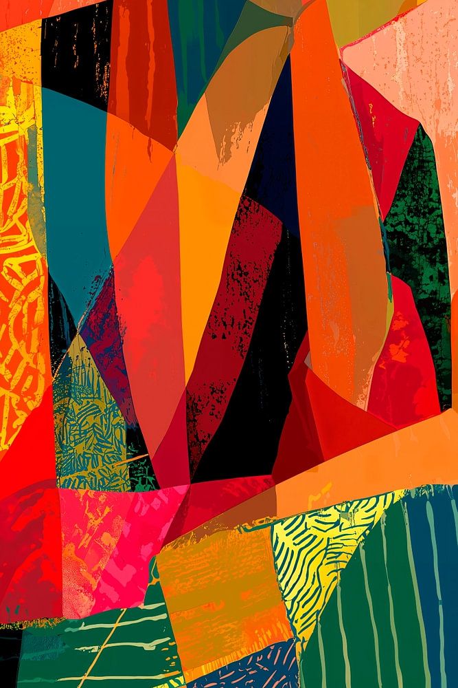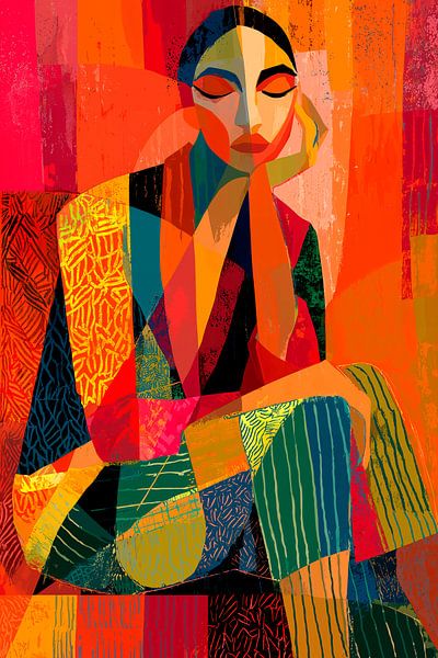 Un portrait abstrait d'une femme à l'air pensif, représenté dans un style vivant et géométrique. Le corps et les vêtements sont représentés comme une mosaïque de motifs et de textures variés. L'impression générale est celle d'une expression artistique audacieuse, avec une utilisation saisissante de la couleur et de la forme.