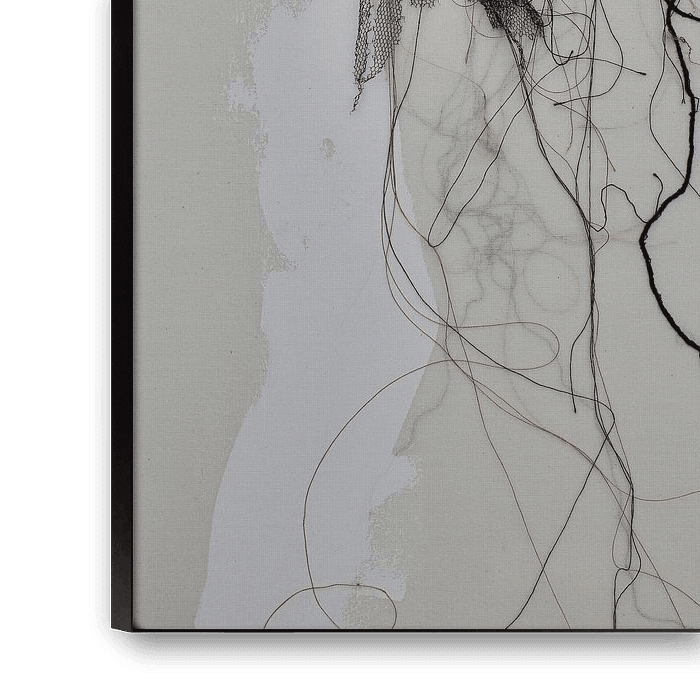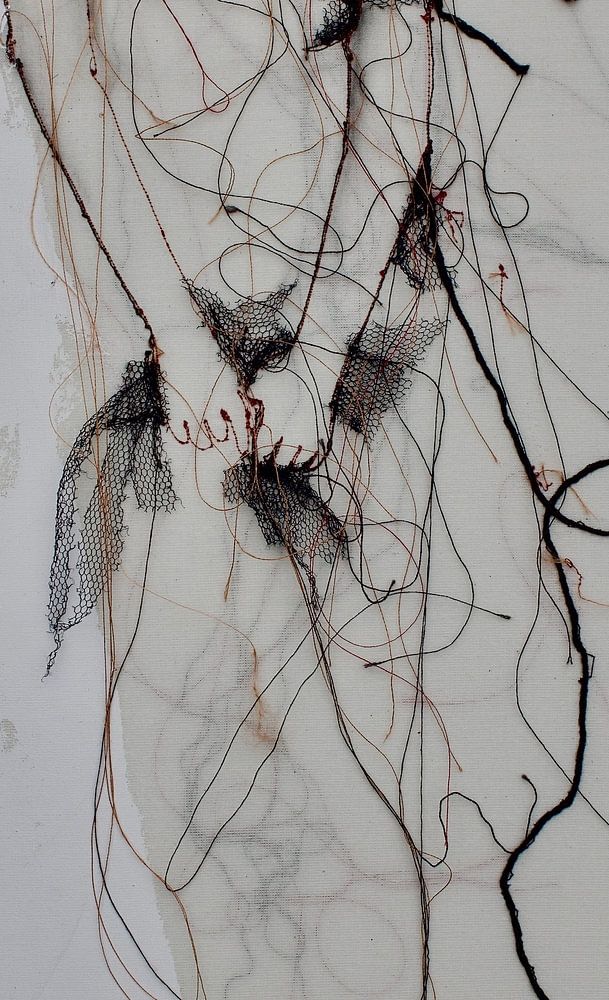 Le jeu avec la lumière du soleil et la disposition des fils lâches donnent une impression de profondeur. Une femme/fille qui regarde dans ses mains l'idée de sa robe. Les œuvres de Kim ont une charge émotionnelle, mais elle laisse au spectateur la possibilité de créer sa propre histoire. Figures féminines, sensualité, force et vulnérabilité. La structure et la texture des différents matériaux prennent tout leur sens dans les œuvres de Kim. Les fils lâches représentent la croissance et le mouvement.