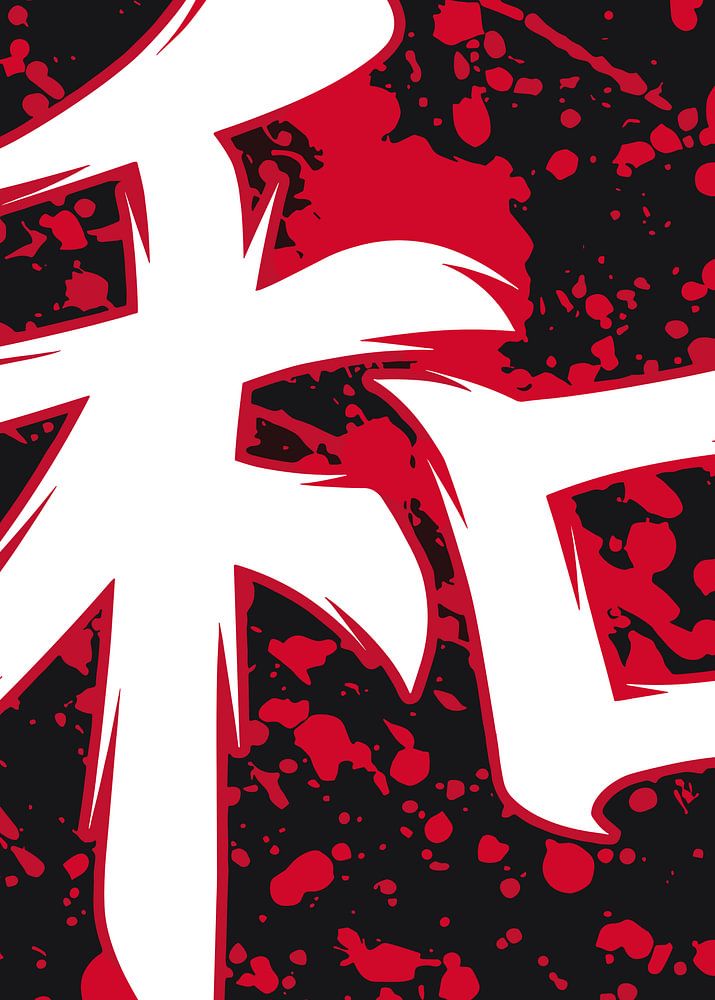 Une représentation vivante et artistique du kanji "和" (wa), qui signifie "paix". Le caractère est représenté en blanc frappant sur un fond abstrait rouge et noir, avec le mot "PEACE" stylisé en dessous pour mettre l'accent.
