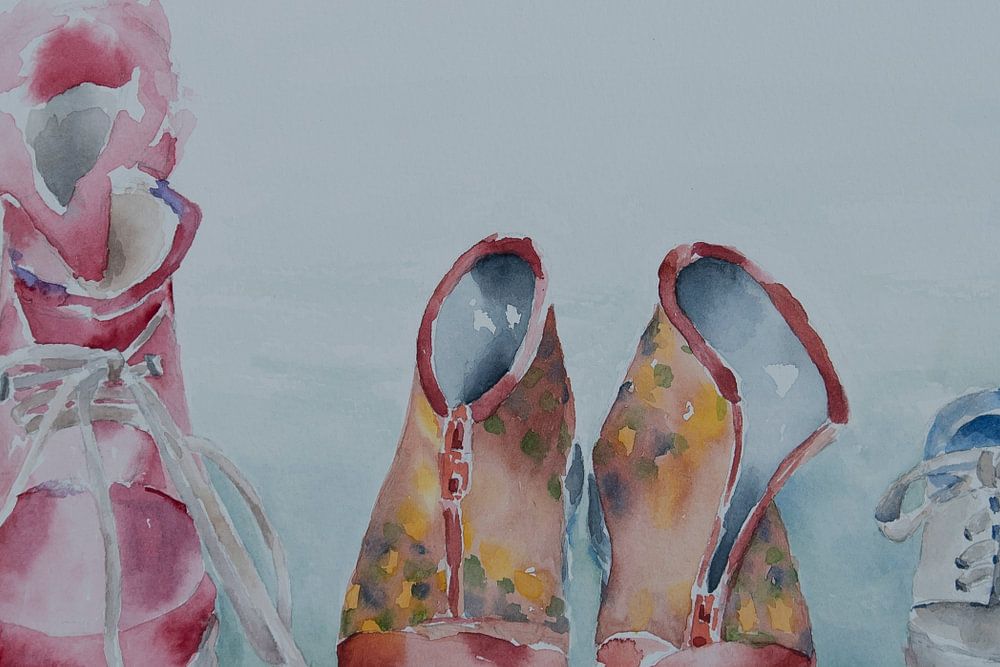 Stilleven van kinderschoentjes, echt gebruikt, in aquarel.