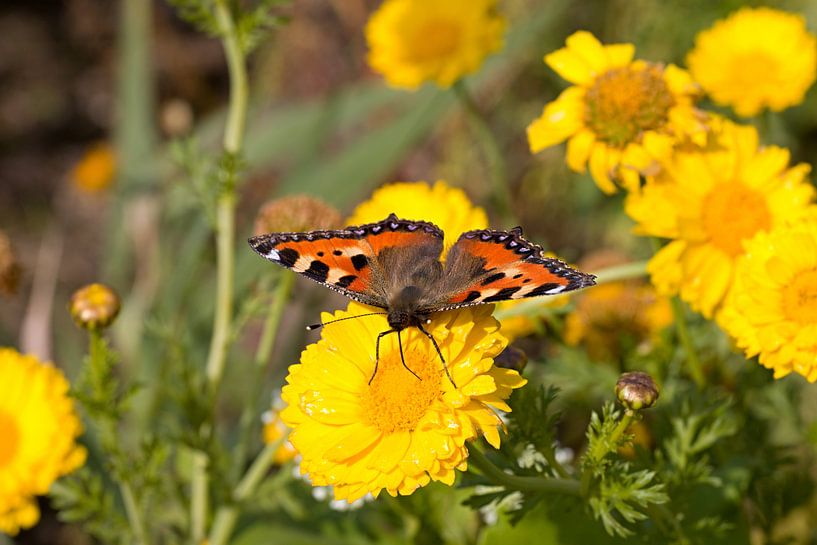 Aglais urticae Kleine vos aan de rand van een akker op een gele ganzenbloem