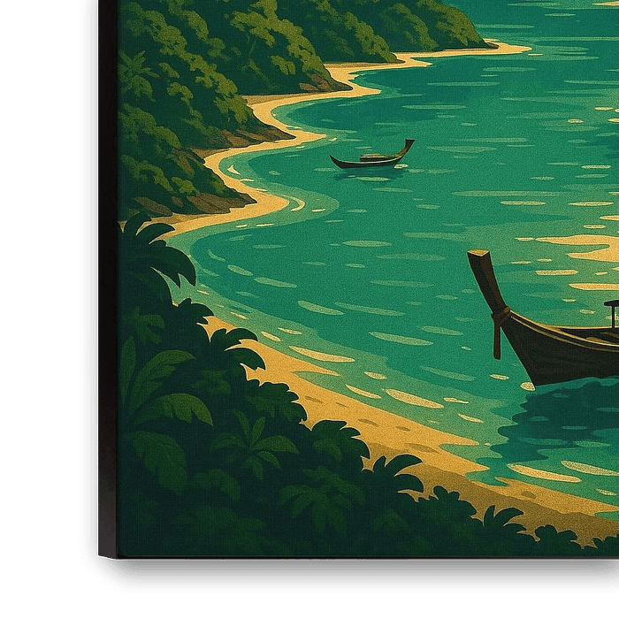 Cette œuvre d'art capture l'essence du paradis côtier de Koh Chang - une baie sereine, éclairée par le soleil et entourée d'un feuillage tropical luxuriant, d'eaux douces et turquoises et de vagues qui roulent doucement. Koh Chang, l'une des îles les plus précieuses de Thaïlande, est connue pour sa nature intacte et ses plages tranquilles. Cette illustration traduit magnifiquement cette atmosphère en une expérience visuelle paisible et immersive.