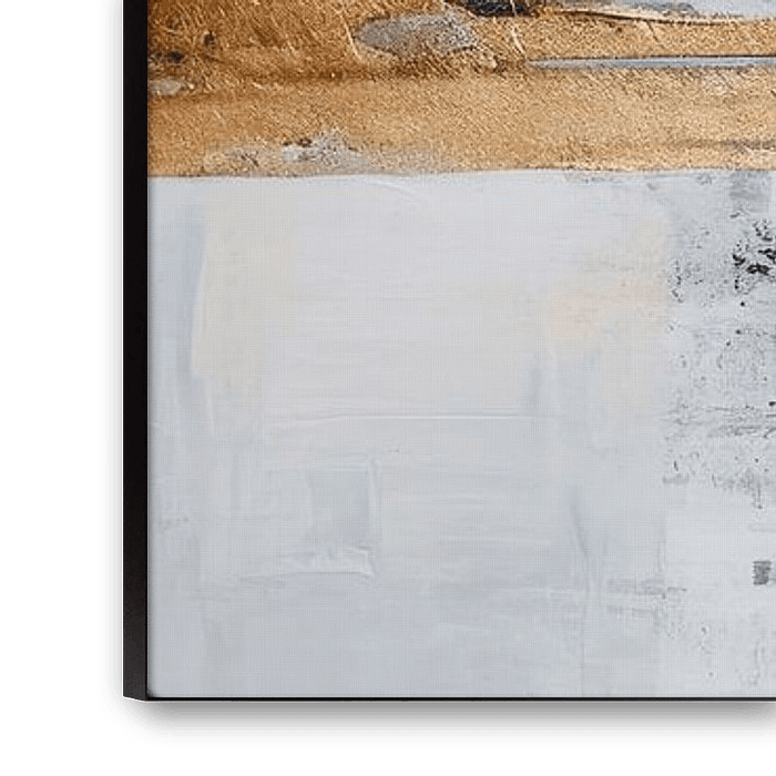 Un art moderne avec des formes dorées, des contrastes atténués ainsi qu'une texture dans des tons gris légers. Cette peinture abstraite au format panoramique dégage une sérénité intemporelle et contemplative. Les couleurs se fondent en une composition harmonieuse.