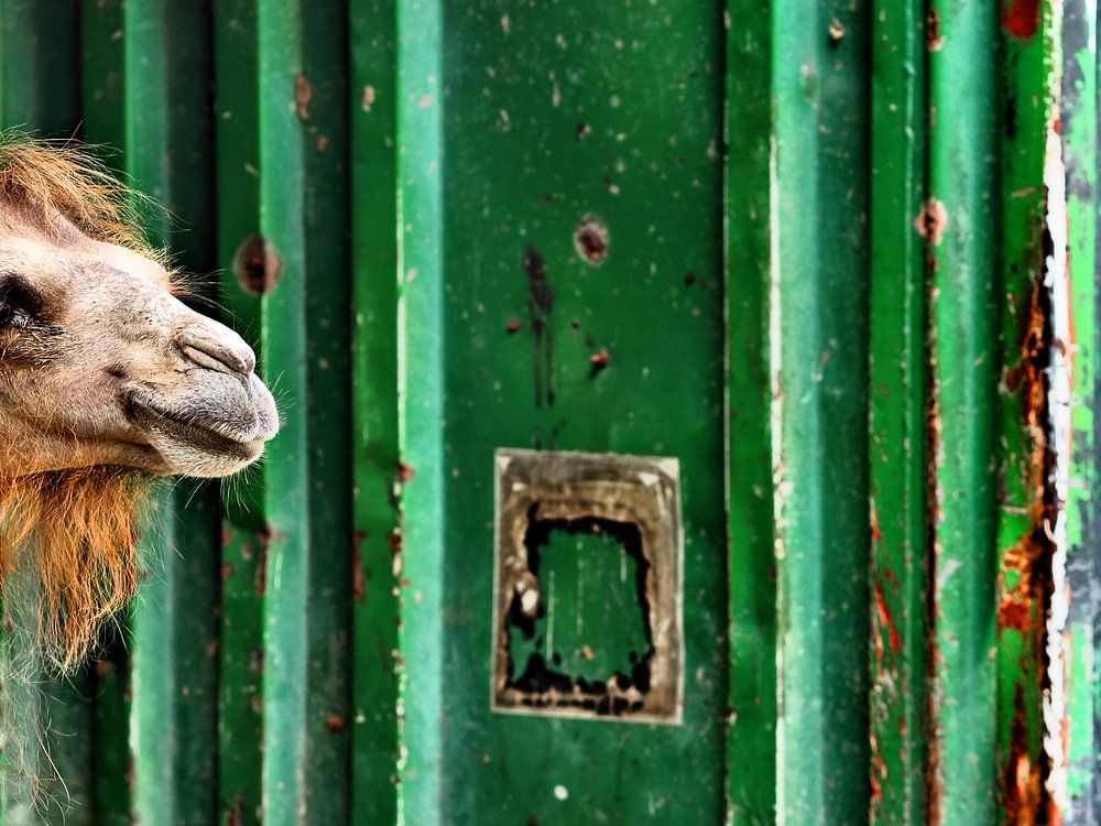 Ce chameau a un abri dans un vieux bâtiment fait de bois et d'un conteneur d'expédition. Avec son apparence miteuse et son fond rouillé, l'animal me fait penser à un vieil ermite qui, depuis son humble demeure, jette un regard inquisiteur sur le monde extérieur.