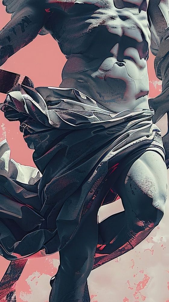 La figure a une apparence divine et classique, avec un corps musclé et une robe spectaculaire qui semble danser dans le vent. Les ailes suggèrent une origine angélique ou mythologique, peut-être inspirée par des figures telles qu'Icare ou Hermès. L'ombre et la lumière subtiles donnent à la sculpture un aspect presque vivant, tandis que les accents de couleur modernes et graphiques offrent une interprétation contemporaine d'une sculpture classique.