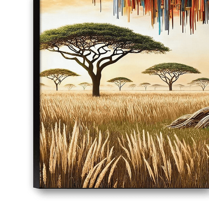 Ce poster numérique extraordinaire montre un arbre imposant dont la couronne n'est pas constituée de feuilles, mais de centaines de livres. Les pages et les dos des livres forment une structure dense et impressionnante qui brille dans la lumière dorée d'un coucher de soleil africain. Au milieu d'un vaste paysage de savane parsemé d'acacias isolés, cet arbre symbolise le savoir qui s'est développé au fil des générations - un hommage à l'éducation, à la créativité et aux possibilités infinies de la littérature.