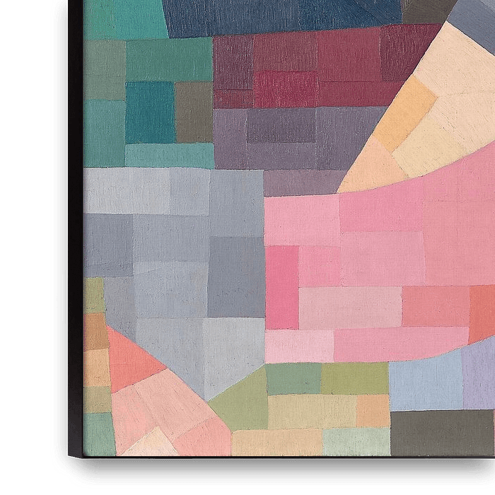 Des cubes et d'autres formes angulaires dans cette œuvre d'art avec de nombreuses couleurs comme le rose, le jaune, le brun, le bleu, le gris et le vert.