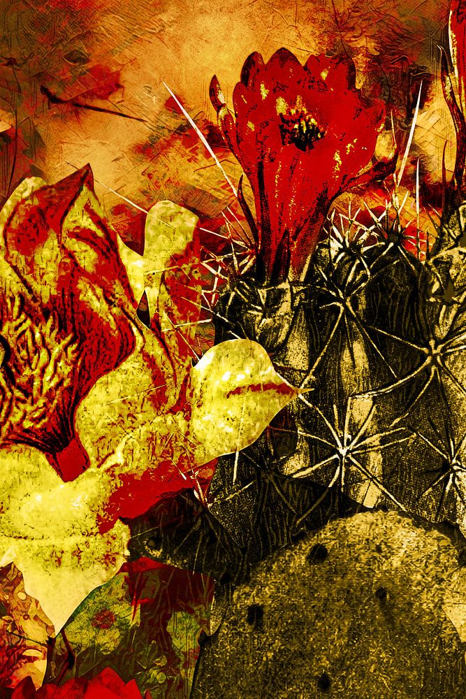 L'autre cactus dans le coucher de soleil peut être pris tout aussi littéralement. Un cactus avec plusieurs grandes fleurs et, bien sûr, de grandes épines, comme c'est le cas pour un cactus, se trouve dans un cadre naturel avec de l'herbe et des fleurs de prairie dans le soleil couchant. Les épines protègent les fleurs magnifiques et spéciales. Particulières parce qu'un cactus ne fleurit pas facilement et qu'il pousse souvent dans des endroits vraiment inaccessibles. Il s'agit d'un paysage artistique dans lequel le cactus joue le rôle principal. Il rappelle peut-être un paysage américain tel qu'on le voit dans les films de western. Un environnement sec où beaucoup de belles choses fleurissent malgré tout. Un cactus en fleur se rencontre surtout dans les pays chauds. La chaleur peut donc être vraiment ressentie et, bien sûr, particulièrement visible ici. Les couleurs sont donc également chaudes et vont du jaune au rouge en passant par l'orange. Le vert est également représenté ici. Cette œuvre pittoresque apporte de l'ambiance et de la chaleur dans votre maison.