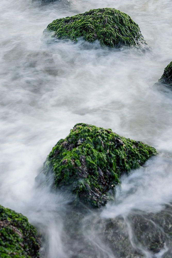 De lourdes pierres recouvertes d'algues vertes le long de la côte de la mer du Nord sur une digue de la côte de la mer du Nord entre Dombrug et West Kapelle sur l'ancienne île de Walcheren. L'eau mystique ondule le long de la digue avec des pierres dans l'eau de mer qui a été photographiée avec une longue vitesse d'obturation. L'eau laiteuse s'agite sur les rivages des plages des Pays-Bas, près de la côte en Zélande.