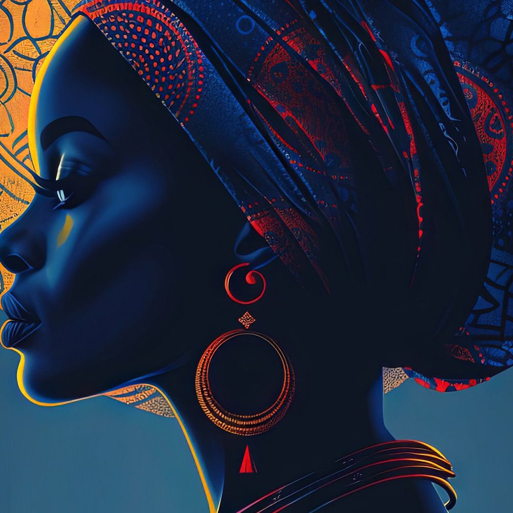 L'image montre le profil d'une femme portant un foulard artistiquement plié. Sa peau rayonne dans des tons bleus et noirs profonds, tandis que l'arrière-plan scintille de couleurs chaudes et lumineuses. Elle porte des bijoux voyants, dont de grandes boucles d'oreilles et un collier, qui ajoutent de l'éclat à son apparence élégante.