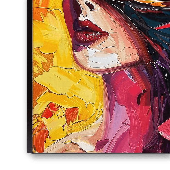 Ce portrait expressif d'une femme montre un visage encadré de couleurs vives. La structure épaisse des couleurs confère à l'image une forte tridimensionnalité et une énergie palpable. Le mélange vivant de rouge, de jaune, de bleu et de violet crée une atmosphère explosive, pleine de passion et de créativité. Cette œuvre s'adresse aux spectateurs qui aiment les couleurs audacieuses et les expressions puissantes et qui souhaitent apporter une touche d'intensité à leurs espaces.