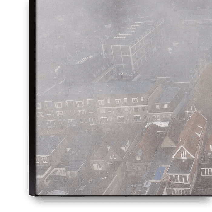 Une épaisse couche de nuages et de brouillard matinaux recouvre la ville d'Alkmaar. Dans une rare éclaircie, la Grote Kerk s'élève au-dessus du brouillard.
