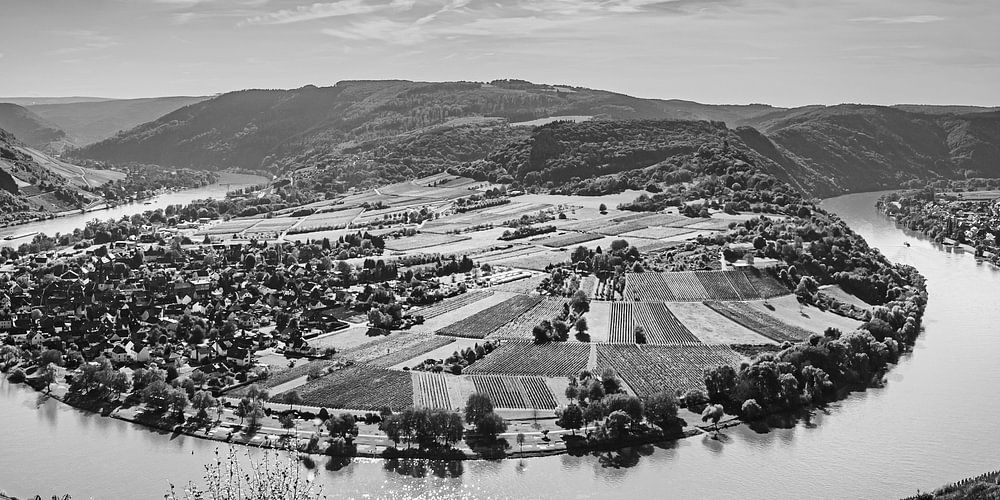 Image panoramique 2:1 en noir et blanc d'un méandre de la Moselle surplombant les villes de Kröv et Wolf (Traben-Trarbach) dans le Land de Rhénanie-Palatinat, dans l'ouest de l'Allemagne.