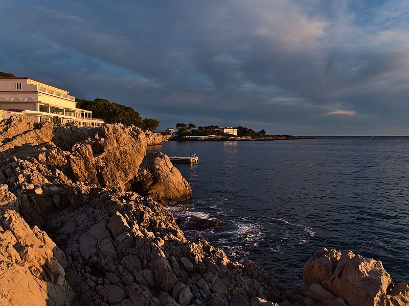 Photo de rochers escarpés au soleil couchant sur la "Baie des milliardaires" à Antibes, France sur la Côte d'Azur avec des propriétés luxueuses sur la côte.