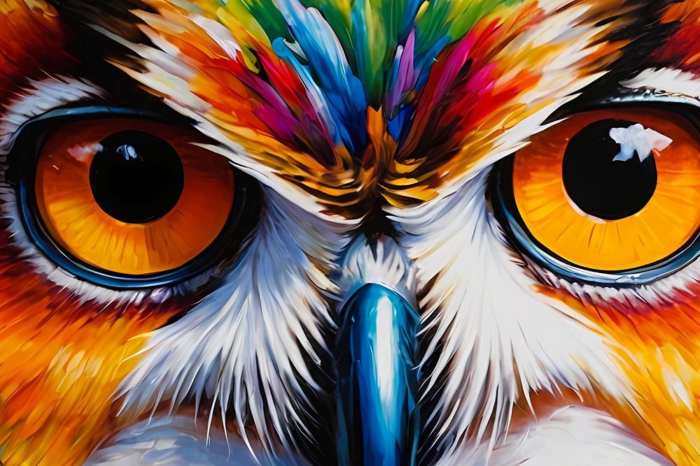 Cette peinture présente une interprétation impressionnante et colorée d'un hibou. L'animal est représenté dans une explosion de teintes vives, telles que le jaune, l'orange, le bleu, le vert et le rouge, qui se fondent en un motif dynamique. Les yeux orange vif contrastent fortement avec le fond bleu profond, évoquant un sentiment d'intensité et d'énergie. Les coups de pinceau épais donnent à l'œuvre de la texture et du mouvement, ce qui donne l'impression que le hibou vibre de vie et de vigueur. L'œuvre capture l'essence de la sagesse et de la vitalité dans un style moderne et expressif.