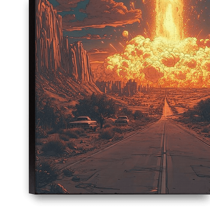 Une voiture solitaire roule à toute allure sur une route déserte alors qu'une explosion massive consume l'horizon. Ce chef-d'œuvre cinématographique capture l'intensité brute de la destruction, juxtaposée au calme inquiétant du voyage d'un seul véhicule à travers le chaos. L'éruption enflammée illumine la scène avec des détails à couper…