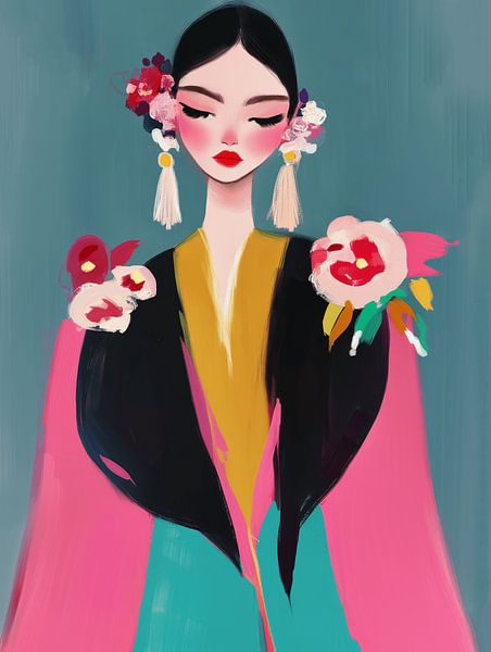 Les détails floraux dans les cheveux et sur les épaules ajoutent une touche ludique et romantique. Pensez à une muse contemporaine : élégante, créative et un brin rebelle. Les coups de pinceau expressifs et le doux dégradé de couleurs donnent à cette œuvre un aspect vibrant et artisanal, parfait pour ceux qui aiment l'art mural coloré avec une touche féminine.