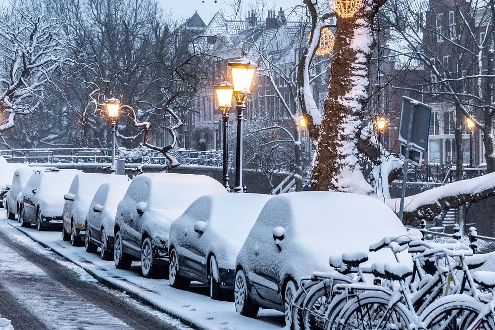 Deux personnes marchent dans la neige sur l'Oudegracht à Utrecht.