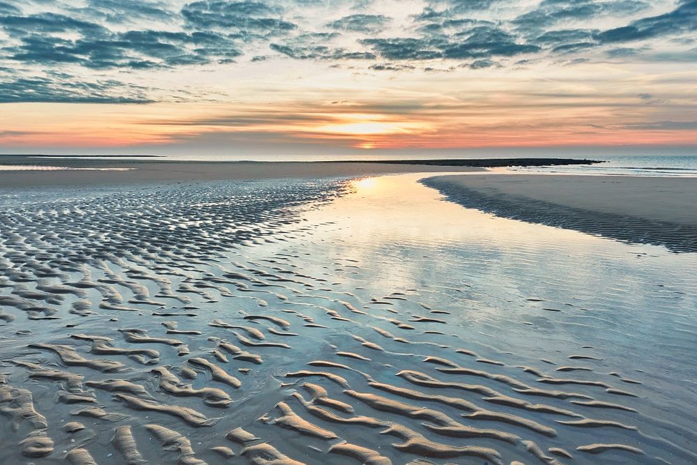 Magnifique coucher de soleil avec reflet des nuages sur la mer du Nord et la plage néerlandaise de la mer du Nord. Structures spéciales de sable sur la plage de la mer du Nord avec l'eau de mer et le sable.