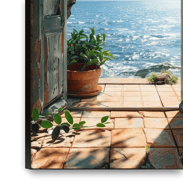 Cette œuvre d'art gratuite et tendance présente une vue enchanteresse de l'intérieur d'une vieille maison jusqu'à la mer scintillante.