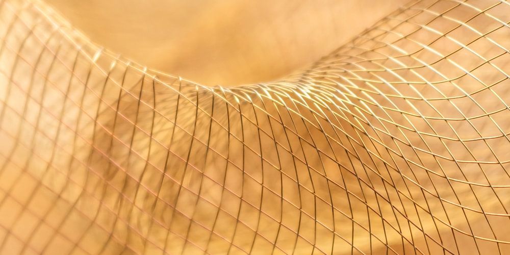 Cette image montre une macrophotographie d'un tissu réticulé de couleur dorée avec une structure de grille régulière. Les fines lignes du matériau se croisent dans une grille claire et forment de petites ouvertures carrées. La lumière ciblée crée une teinte dorée chaude qui souligne la structure du tissu et rend visible sa forme tridimensionnelle. La légère courbure du matériau confère à l'image une dynamique subtile.
