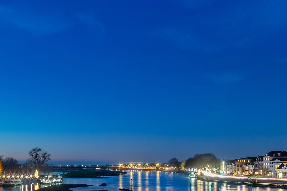 La rivière IJssel près de Deventer le soir avec une ville illuminée