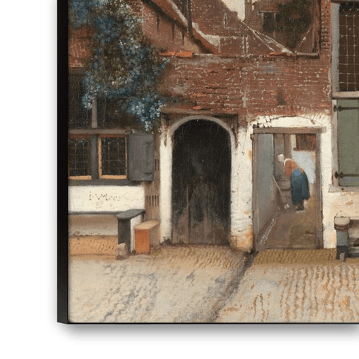 Vue des maisons de Delft, connues sous le nom de'La rue'. Les façades de plusieurs maisons sur une rue de Delft. Entre les maisons, une ruelle avec une femme debout au-dessus d'une baignoire. Dans la porte ouverte de la maison à droite, une femme travaille, à gauche devant la maison, deux enfants jouent sur le trottoir.