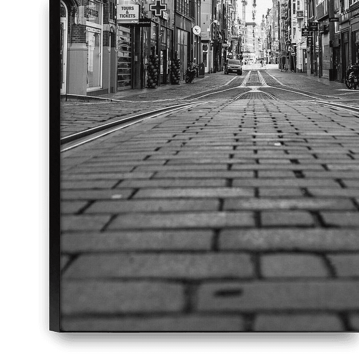 Rue commerçante presque déserte de la Leidsestraat à Amsterdam, un matin de semaine. Peu de gens marchent dans la rue avec les rails de tramway qui se croisent au milieu. Photo en noir et blanc.
