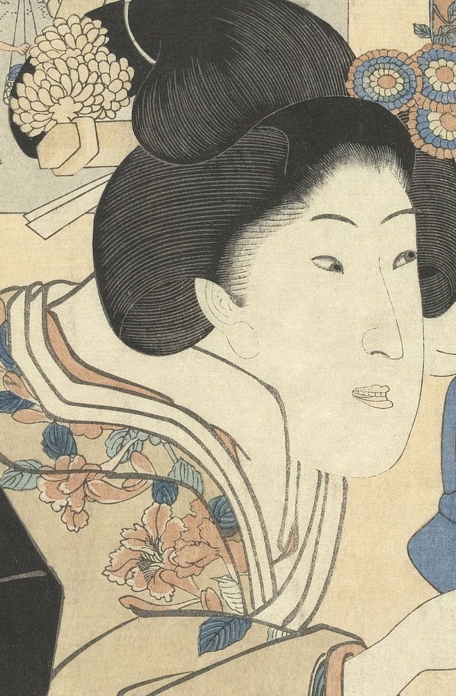"Femme avec bouilloire à saké bleue ; sur fond jaune avec cartouche dans lequel figure un visage sur une plage avec des hommes déchargeant des paniers de crabes d'un bateau" gravure sur bois en couleur ukiyo-e Achat du F.G. Waller Fund Rijksmuseum, Amsterdam
