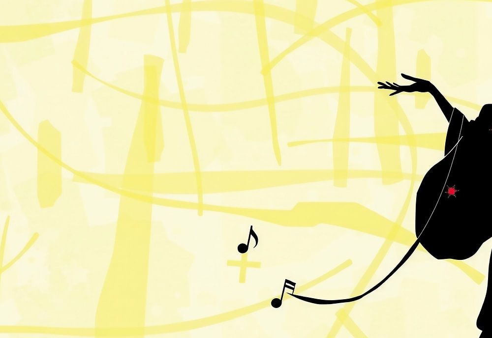 Une silhouette mystique d'une personne exécutant un mouvement de danse en tenue traditionnelle. L'arrière-plan est décoré de motifs abstraits discrets. Des notes de musique semblent émaner du personnage, ce qui crée un lien avec l'art et l'expression des émotions.
