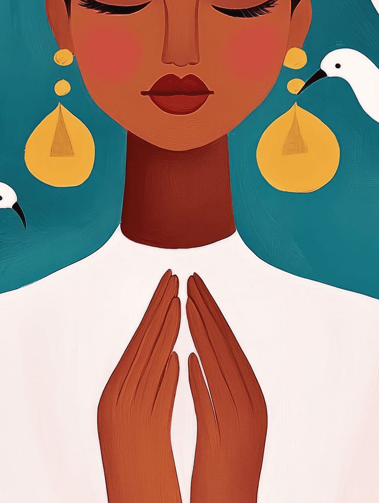 Peace in mind&quot ; une illustration colorée d'une jeune femme avec deux colombes de la paix. Un accroche-regard particulier pour votre intérieur ! Une œuvre spirituelle porteuse d'un message.