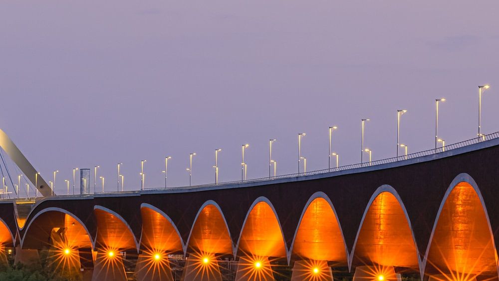 Une soirée au coucher du soleil à l'Oversteek, également appelé City Bridge, un pont pour la circulation des voitures sur la rivière Waal, à Nijmegen. La route qui traverse le pont porte le nom de General James Gavinsingel depuis 2016.