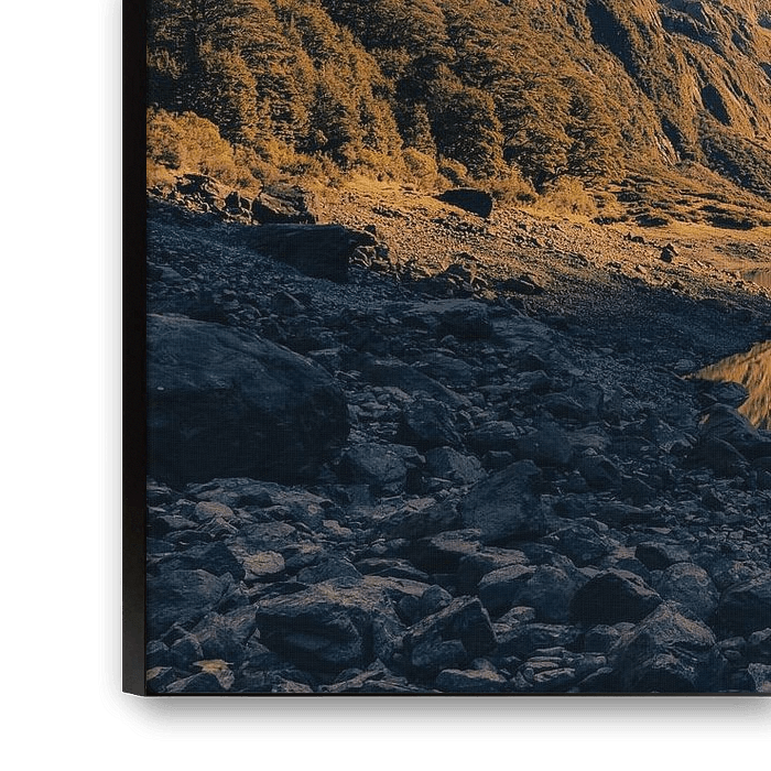 Cette photographie de paysage à couper le souffle capture la magie de l'heure dorée dans une vallée de montagne isolée, le lac Marian, en Nouvelle-Zélande. La lumière chaude et douce du soleil couchant jette une lueur dorée sur les parois rocheuses et se reflète parfaitement dans l'eau calme. La tranquillité, la profondeur et le contraste entre l'ombre et la lumière donnent une impression de calme et d'émerveillement. Une image puissante et atmosphérique qui laisse parler la beauté d'une nature intacte.