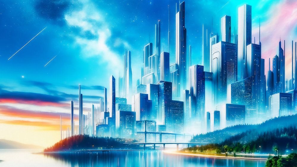 Cette œuvre d'art représente une ville futuriste nichée dans un paysage naturel. Au premier plan, la silhouette de la métropole se reflète dans la surface lisse d'un lac paisible, entouré de douces collines et d'une rive boisée. L'architecture de la ville est moderne et se caractérise par des gratte-ciel qui s'élèvent vers le ciel et sont enveloppés d'un voile lumineux.