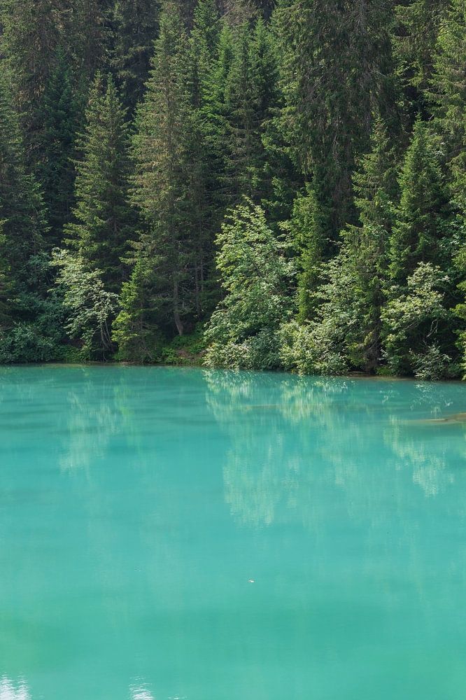 Eau bleu-vert profonde dans un lac près de Courchevel en été. Sans vent et avec de beaux reflets, le lac est très relaxant à regarder. Asseyez-vous et profitez.