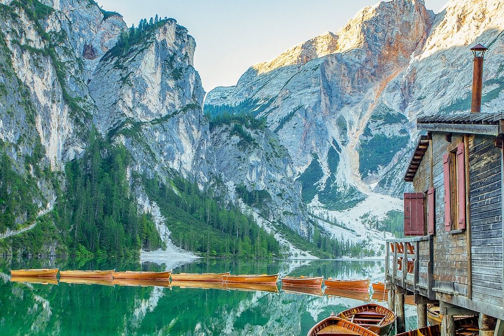 Un beau lac clair dans les Dolemites. Un hangar à bateaux avec des bateaux à rames disponibles à la location pour les nombreux touristes que ce lac attire. L'eau est une eau de montagne fraîche et cristalline. Un lac magnifiquement clair dans les Dolemites. Un hangar à bateaux avec des barques à louer pour les nombreux touristes que ce lac attire. L'eau est une eau de montagne fraîche et cristalline. Le Pragser Wildsee est aussi souvent appelé Lago di Braies. Il s'agit du plus grand lac naturel des Dolomites. Comme partout ailleurs dans les Dolomites, on y parle deux langues. Le nom italien est Lago di Braies, tandis qu'en allemand, c'est Pragser Wildsee. Les deux noms sont largement utilisés pour ce lac merveilleux situé dans les Dolomites en Italie.