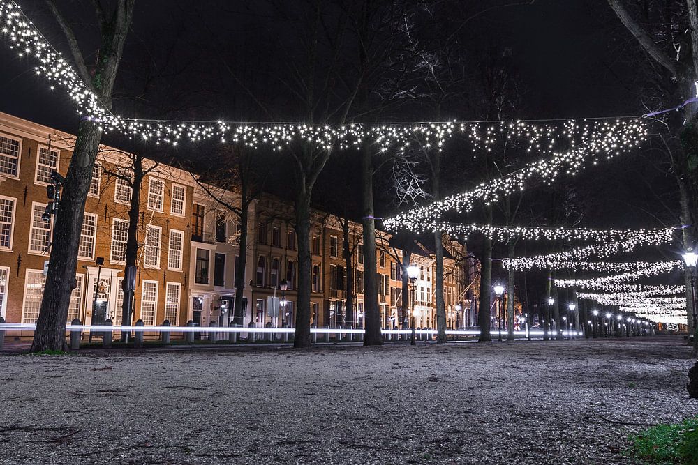 Photo de Lange Voorhout prise de nuit à La Haye. Photo éditée et en couleur avec une vitesse d'obturation lente.
