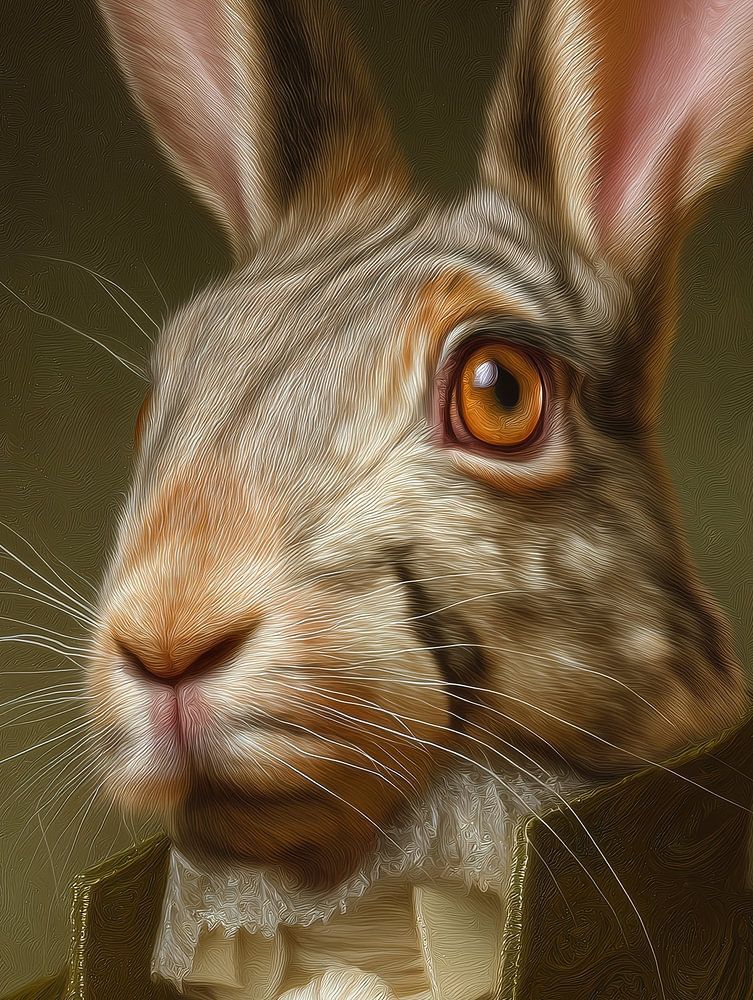 La personnalité conférée à ce lapin est particulièrement impressionnante - son attitude semble assurée et digne, ses grandes oreilles se dressent avec attention. Ce savant mélange de nature et de mode historique crée une œuvre d'art fascinante qui exprime à la fois l'humour et le respect pour la beauté du monde animal.