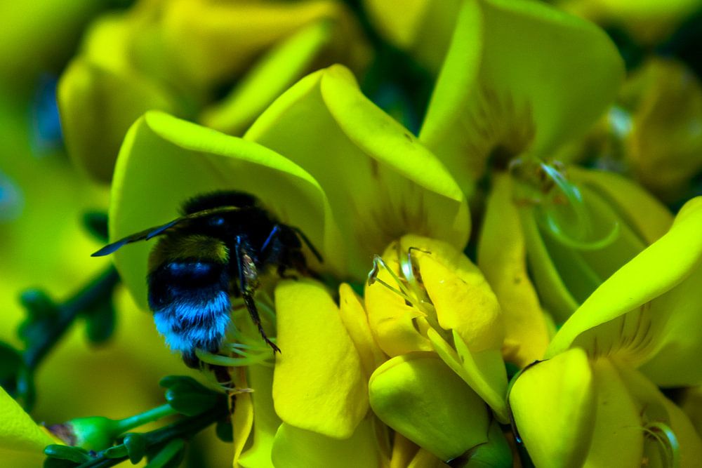 Macrophotographie rapprochée d'un arbuste de Brem avec fleurs et bourdon