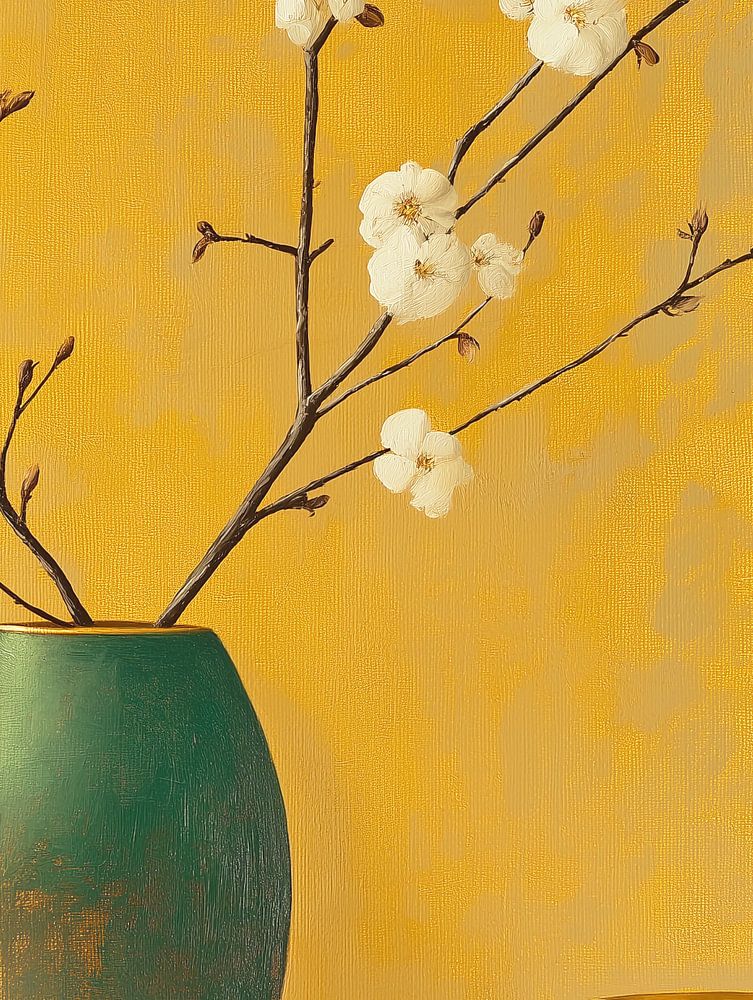 Une nature morte abstraite composée d'un vase vert et d'une tasse à café dorée.