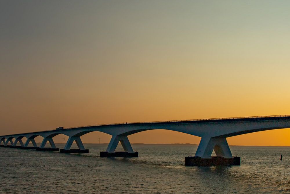 Le pont de Zeeland, Zeeland (Pays-Bas) au lever du soleil. La photo a été prise depuis Colijnsplaat en regardant vers le nord. Cette photographie fait partie d'une série de plus de 20, que l'on retrouve également sur le site.