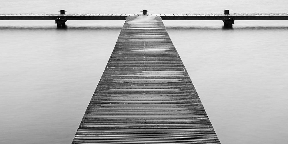 Photographie en noir et blanc 2:1 d'une soirée sur une jetée du Zuidlaardermeer (un lac de 540 hectares avec 120 hectares de terres riveraines), situé au sud de la ville de Groningen, dans la province de Groningen.