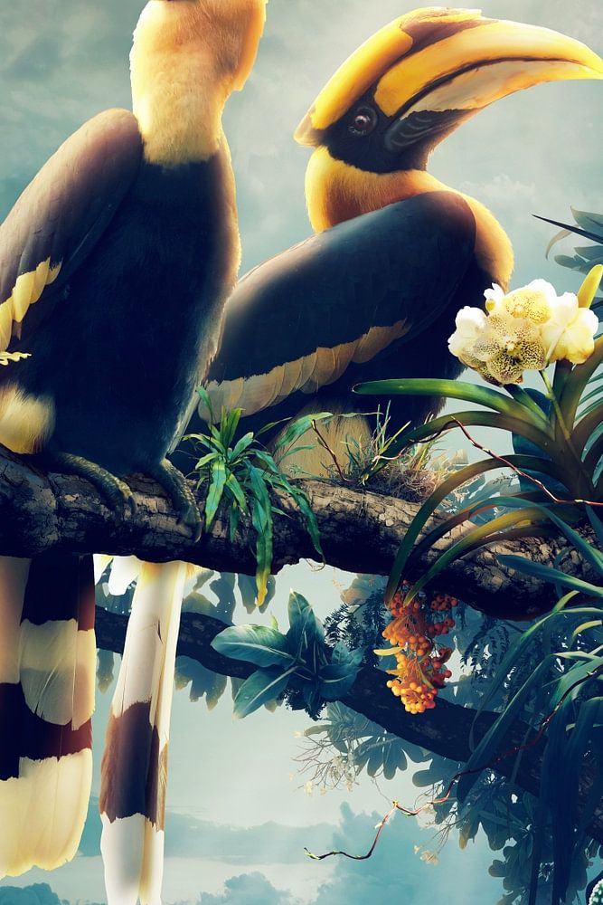 Sous un voile d'orchidées et de lumière filtrée, deux calaos se rencontrent en silence - non pas en tant qu'oiseaux, mais en tant qu'échos d'une connexion. L'un est parti, l'autre est resté, porté par le souffle du crépuscule.