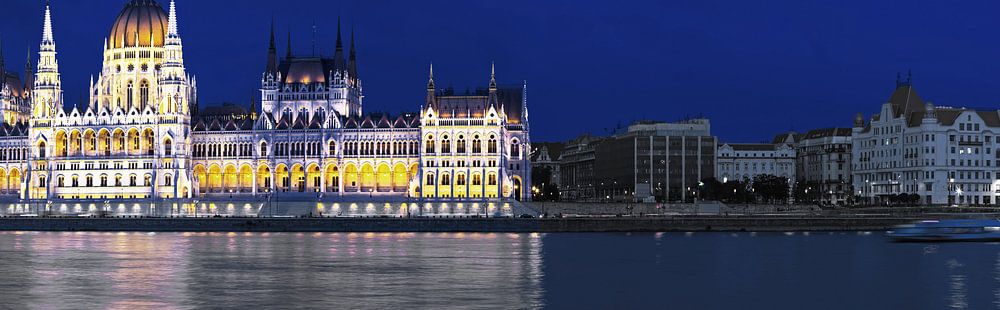 Le bâtiment du Parlement à Budapest - Panorama à l'heure bleue par Frank Herrmann