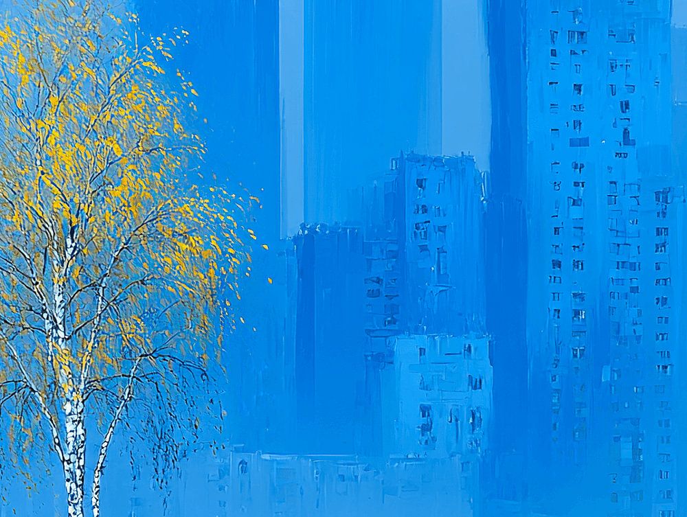 Cette œuvre d'art enchanteresse et légèrement déchirante, Le bouleau solitaire dans la ville bleue, montre un petit bouleau doré qui représente la seule couleur et la seule vie dans une immense ville bleue glaciale…