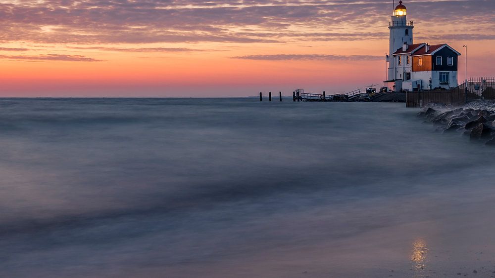 Un ciel magnifique au phare frappant "Het Paard van Marken" juste avant le lever du soleil.